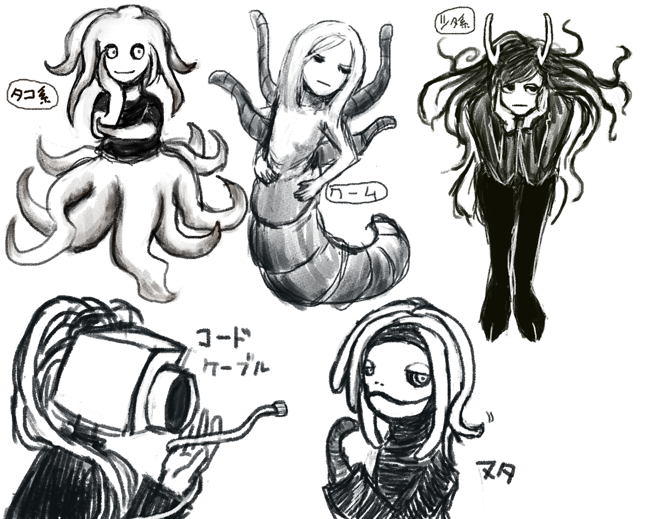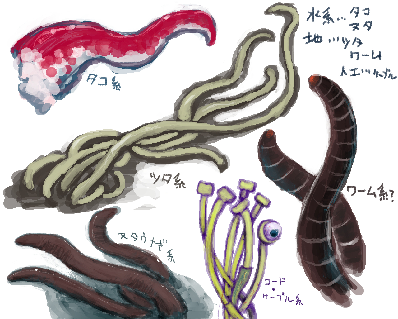 「触手」というパーツがスキなんだけど、色んな種類があるよなと思ったので色々描いてみたもの。